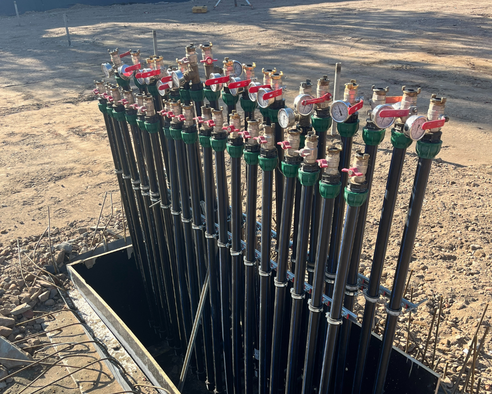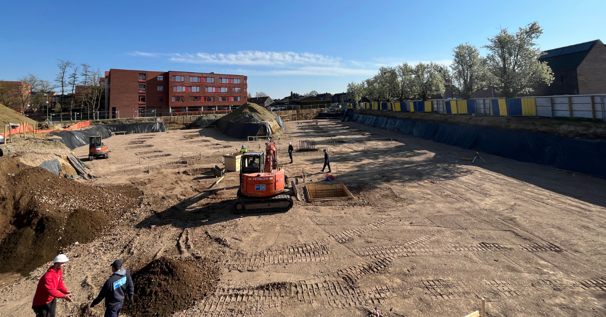 Het volledige BEO-veld is geïnstalleerd onder de betonnen kelderplaat, die vorige week werd gestort. Dat betekent dat er vanaf nu volop kan worden gestart met de volgende bouwfase van het woonproject.